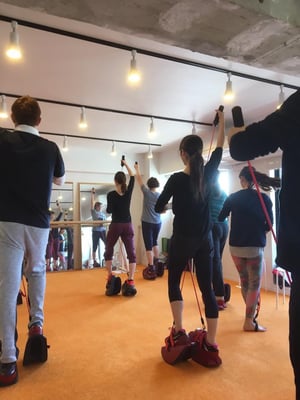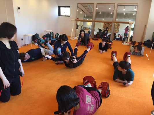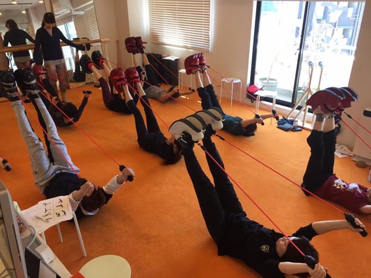レッスン中の写真はaranciaさんのFacebookページから拝借致しました。マスターストレッチに付いている縄跳びのような器具がバンジートーンです!